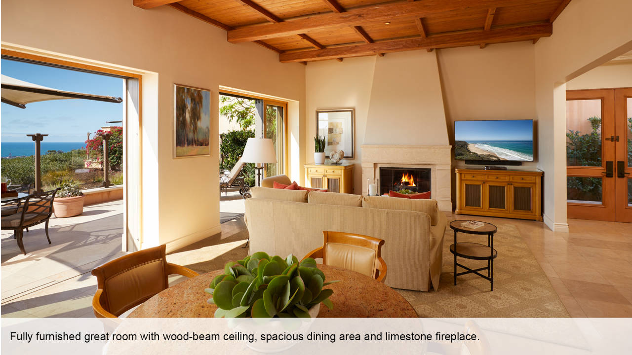 - Fully furnished great room with wood-beam ceiling, spacious dining area and limestone fireplace