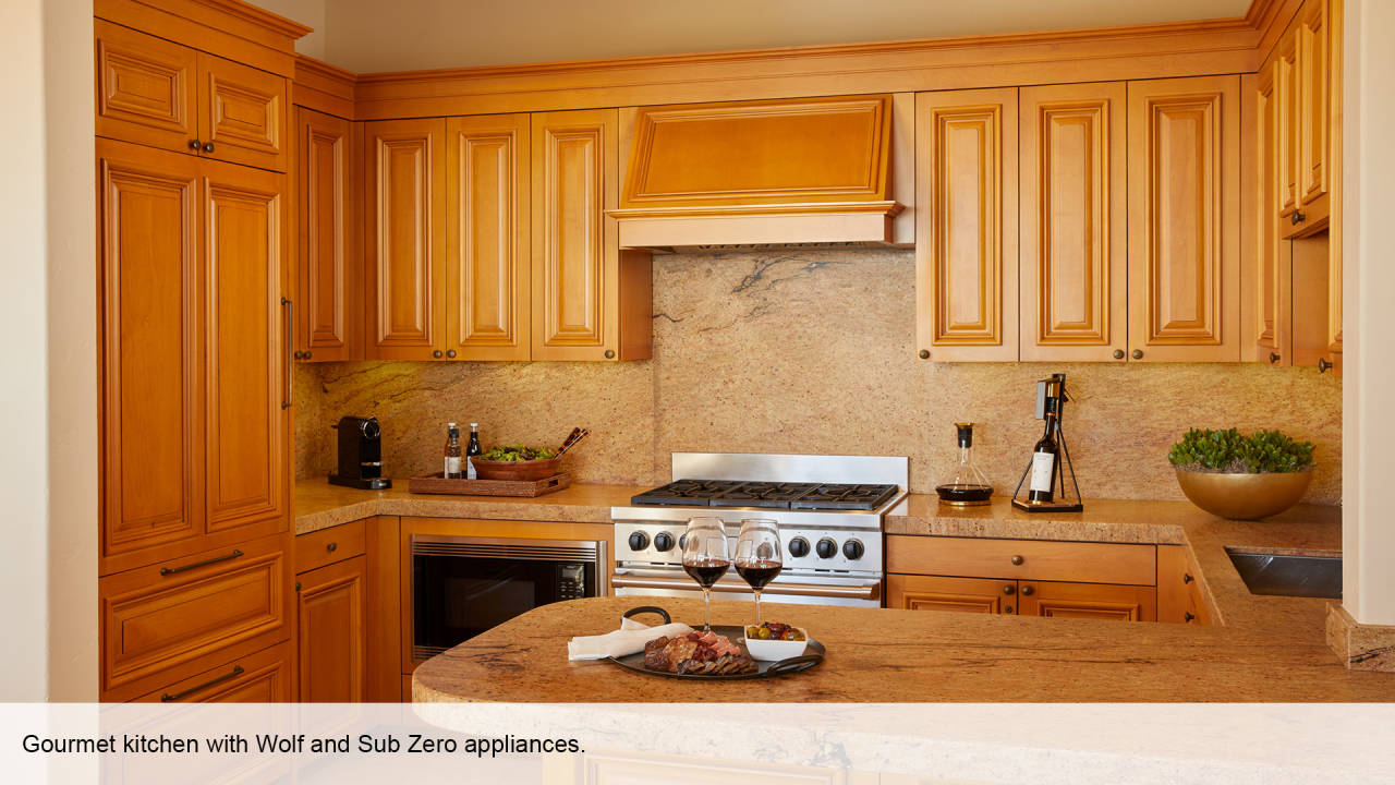 - Gourmet kitchen with Wolf appliances, Sub Zero refrigerator & wine cabinet, rich granite counter tops, fruit wood cabinetry, and essential cookware