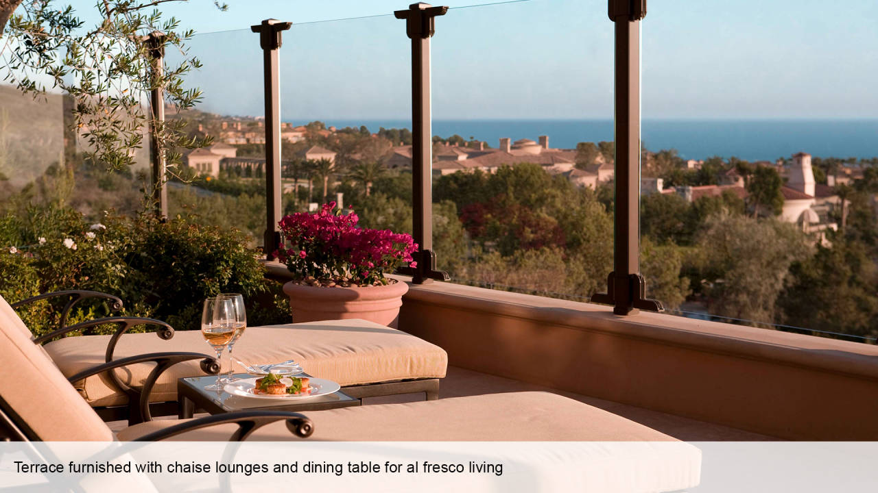 - Ocean-view private terrace furnished with chaise lounges and dining table