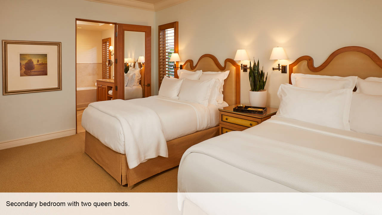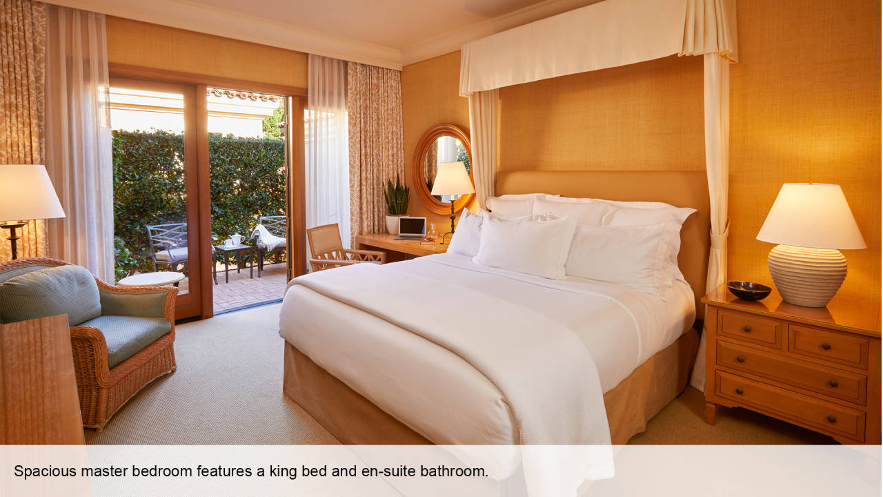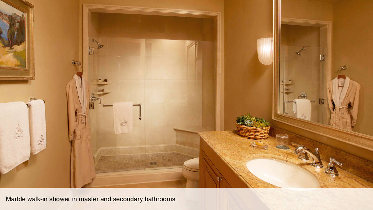 - Spacious master suite features private patio and en-suite bath with marble walk-in shower, deep soaking tub and double basins